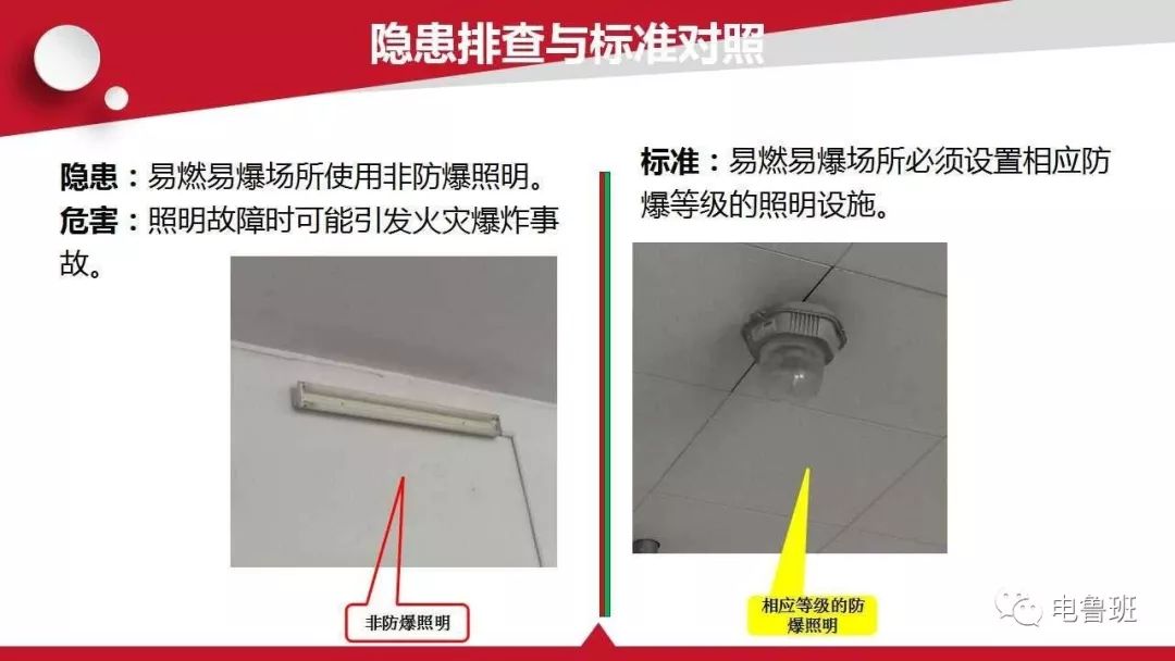 及時發(fā)現(xiàn)設備故障的前期征兆,將設備故障消除在萌芽狀態(tài),才能做到安全生產。下面分享幾組電氣設施隱患排查與標準對照,各工廠、企業(yè)負責人或者員工可以對比自查。