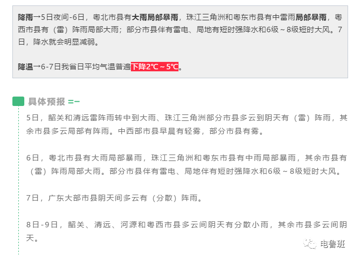據(jù)@廣東天氣 發(fā)布:預(yù)計(jì)受冷空氣影響,5-6日,我省將有中到大雨局部暴雨,部分市縣伴有雷電,局地有短時強(qiáng)降水和6~8級短時大風(fēng)。