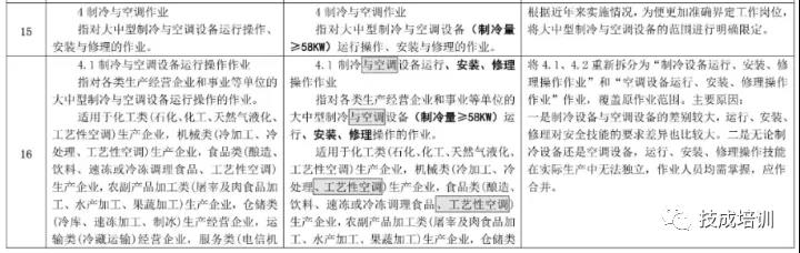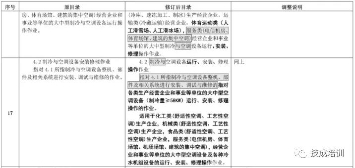 將原“制冷與空調(diào)設備運行操作作業(yè)”、“制冷與空調(diào)設備安裝修理作業(yè)”2 個操作項目修改為“制冷設備運行、安裝、修理操作作業(yè)”和“空調(diào)設備運行、安裝、修理操作作業(yè)”2 個操作項目。